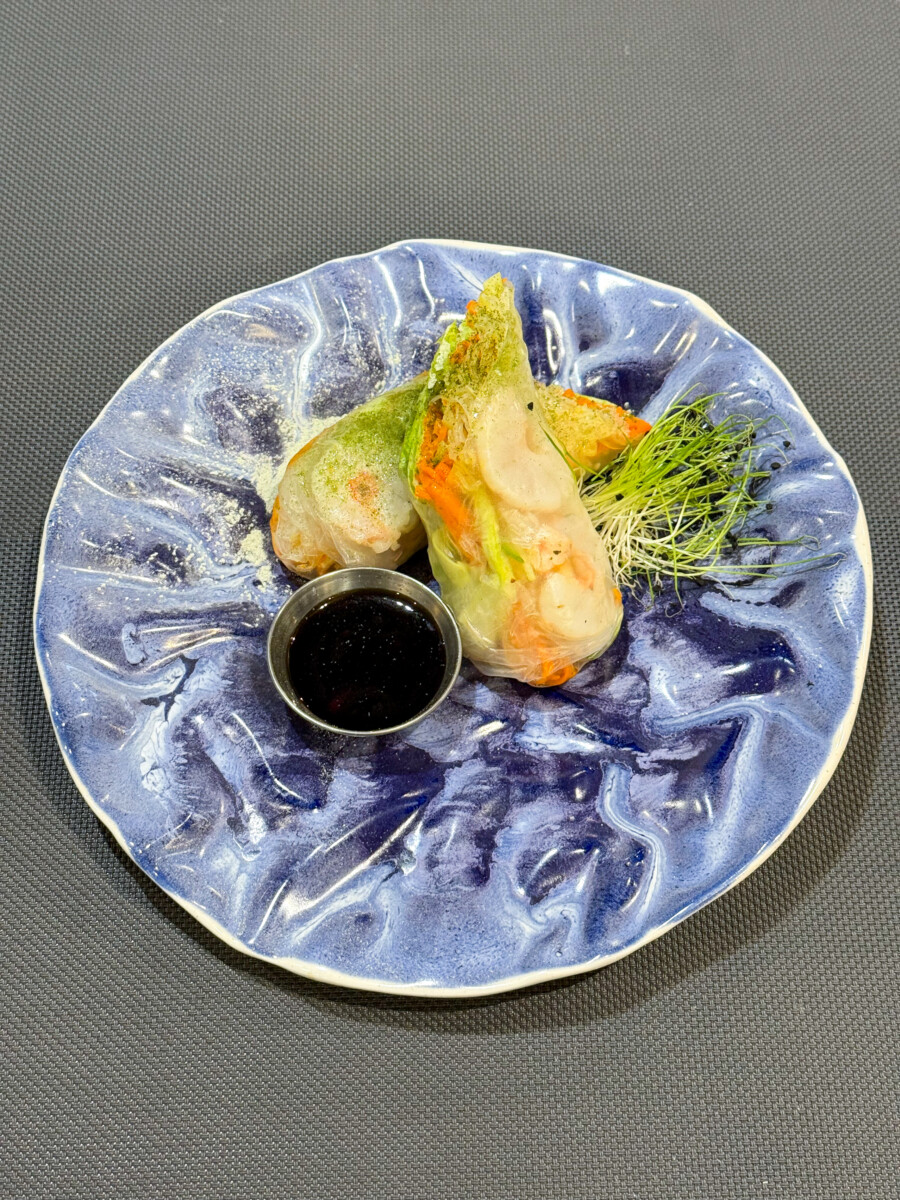 Креветка тигрова, рисовий папір, фунчоза, крем-сир, огірок, молода капуста, морква по- корейськи, арахісовий соус, соєвий соус, зелена пудра, мікрогрін.СПРІНГ РОЛ З КРЕВЕТКОЮ (250гр)